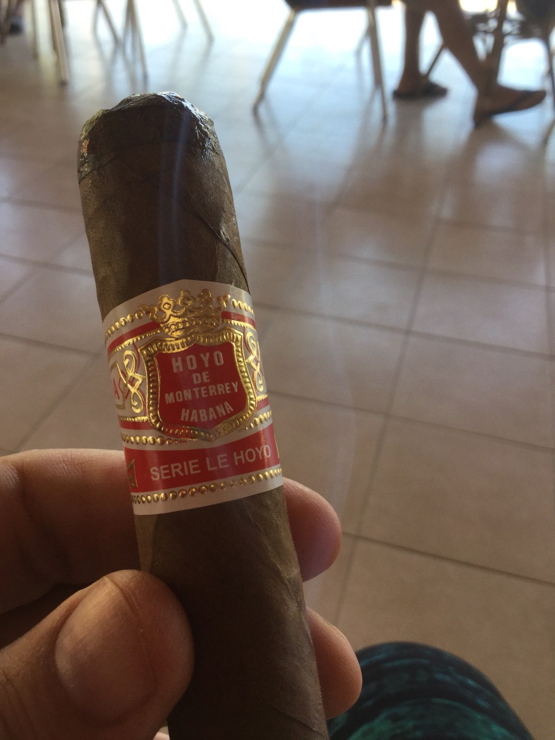 As I write this, it is now Day 2, Sunday afternoon. We spent the morning (after breakfast) frolicking in the ocean, where the water was perfect and the waves were reasonably light. After lunch she decided to take a nap, and I came to sit in the shade by the pool with another cappuccino and a Hoyo de Monterrey Serie le Hoyo. This is one of the singles I picked up at the LCDH at the Nacional, and it is not disappointing. It is soft and creamy, but with a stronger retrohale. Milder than what I have been smoking, it is a very enjoyable cigar. Technically it is a double-band, but it cost less than cuc10, and is a definite bargain at that.