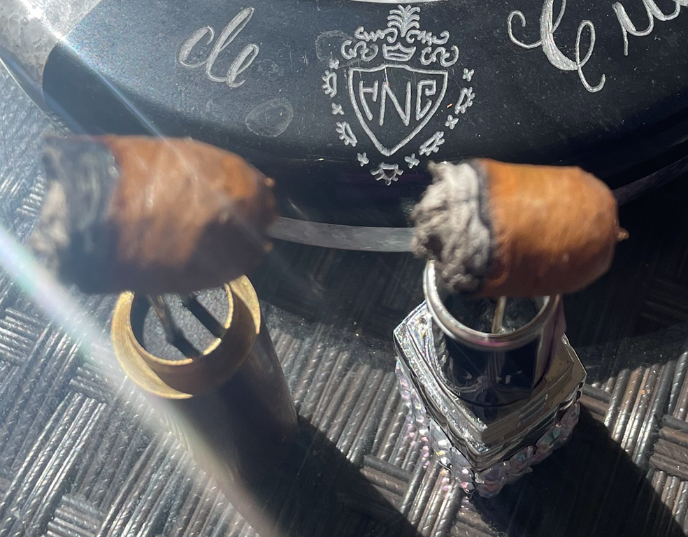 Fortunately, we had our nub tools to prevent disappointment or burnt flesh. Leslie pulled out her ‘lipstick’ Cigar Nubber from BerryUniqueTouch, and I pulled out my Travel Cigar Nubber from WhiskyandCigars (both small Etsy businesses), and we were able to enjoy these fabulous cigars until the delicious and heated end. As well, unlike some tools I have seen, both have flat bottoms, so we were not obligated to hold them in our hands until we were done with them. We could simply stand our tools on the table, and pick them up as needed.